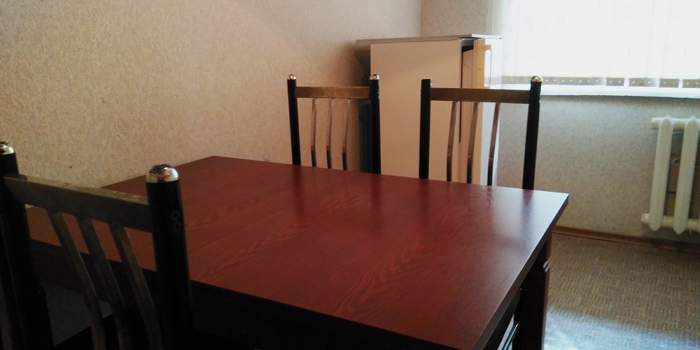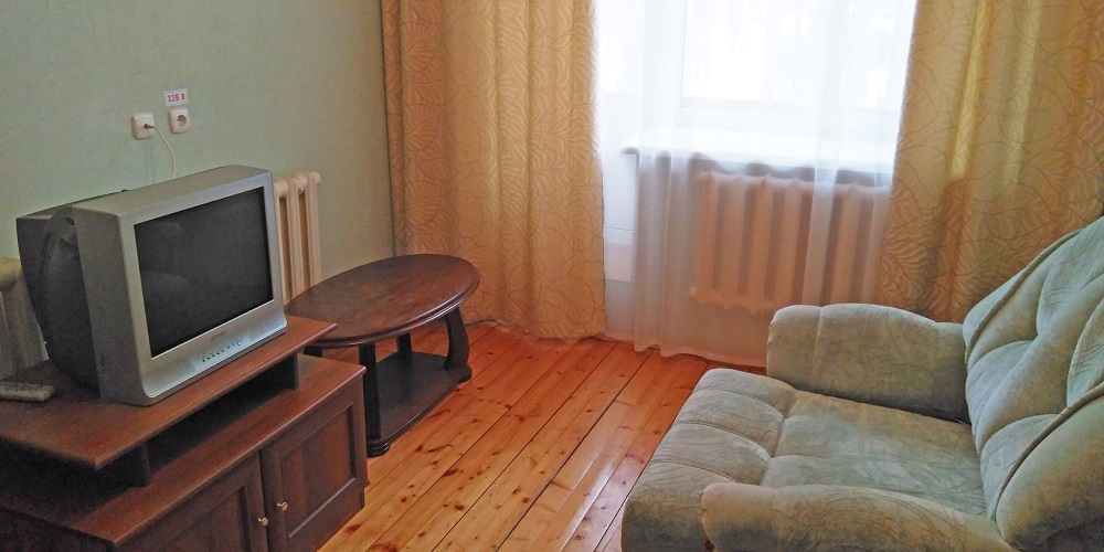 В номере: две односпальные кровати, прикроватные тумбы, стол, стулья, шкаф-купе, холодильник, телевизор