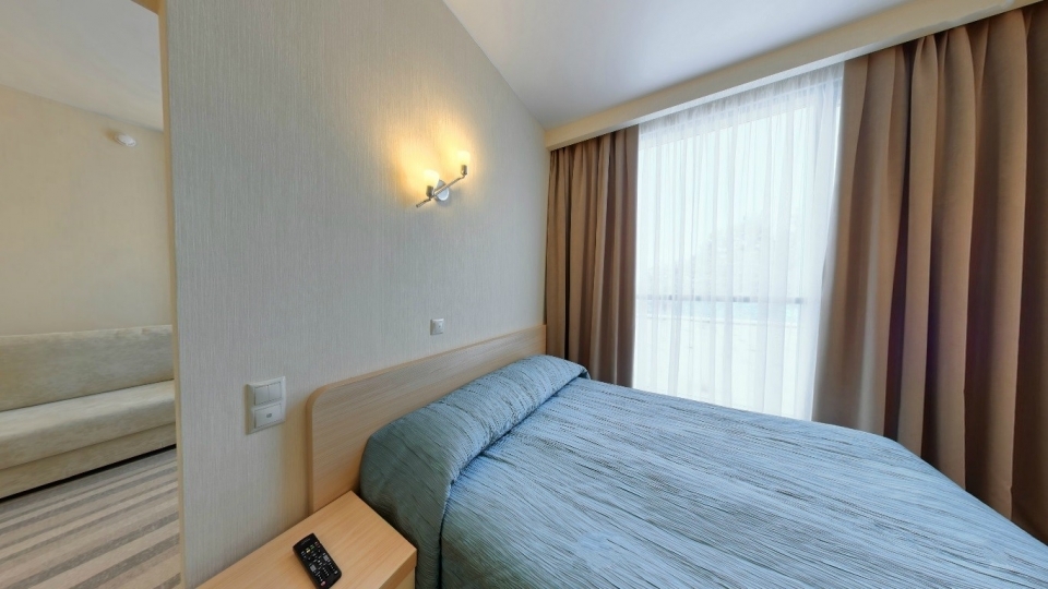 Оснащение номера: две односпальной кровати, кресло-кровать, фригобар, телевизор, сейф, фен, набор посуды: 2 стакана, ваза для фруктов, поднос, wi-fi