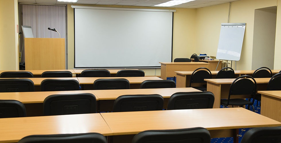 Здесь есть все необходимое оборудование: аудио-акустическая система, микрофоны, экран и проектор, флипчарты.