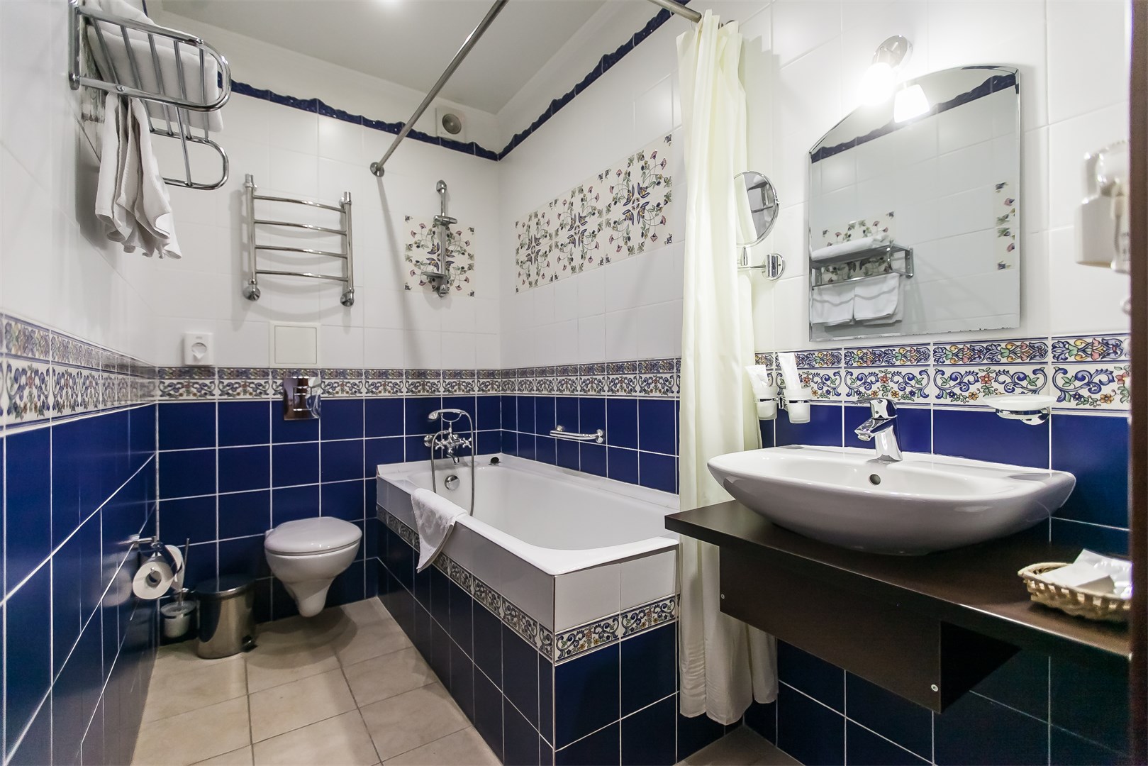 Санузел: угловая ванна, раковина, унитаз, биде, туалетные принадлежности, фен, набор полотенец, тапочки, халат