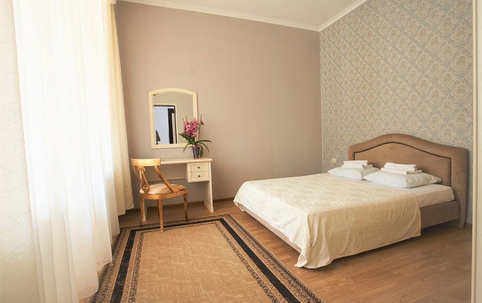 В номере: вешалка, зеркало, кресло, диван, кровати односпальные /одна двуспальная кровать, прикроватные тумбочки, стол, столик журнальный, шкаф, телевизор, телефон, холодильник, чайный набор посуды, электрочайник