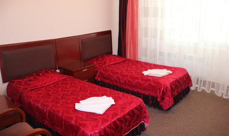 Оснащение номера: кровати односпальные, прикроватные тумбочки, стол, стулья, шкаф, телевизор, холодильник
