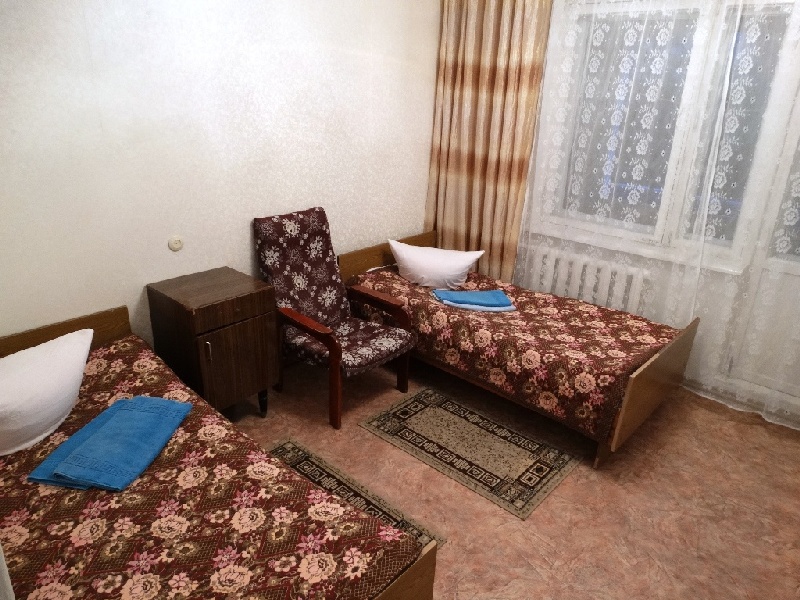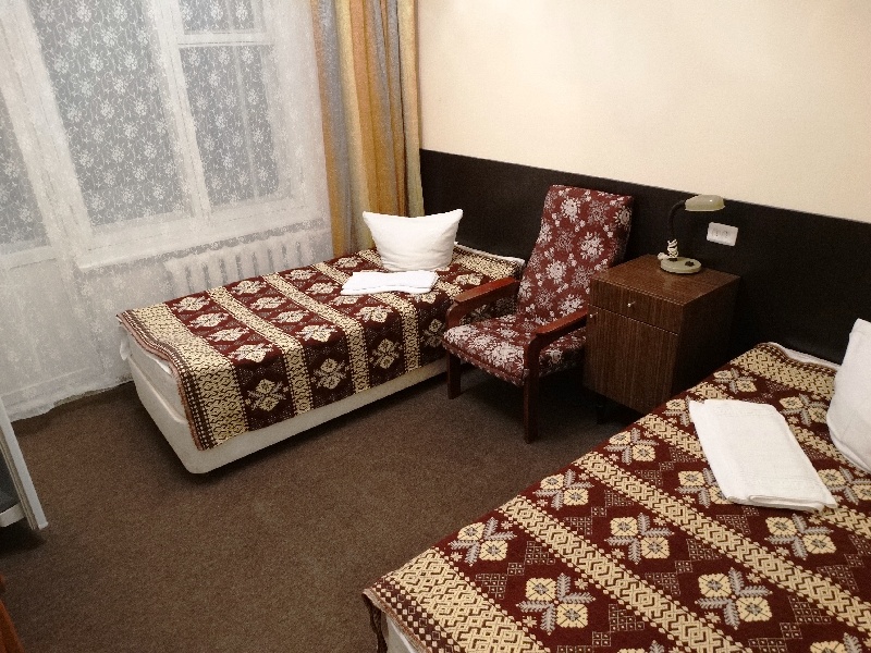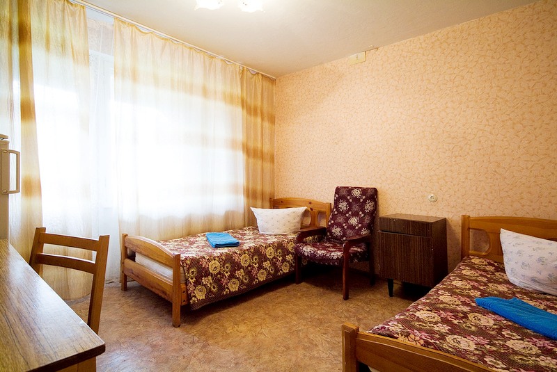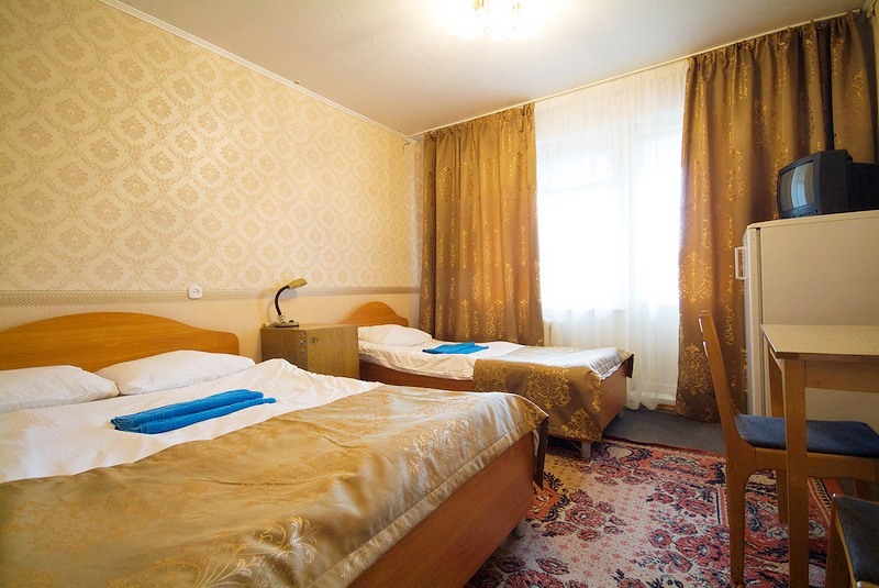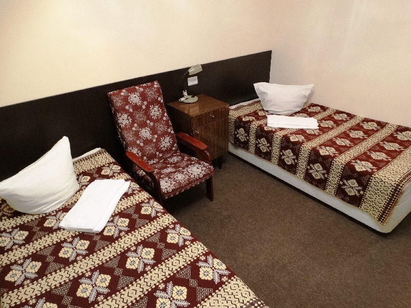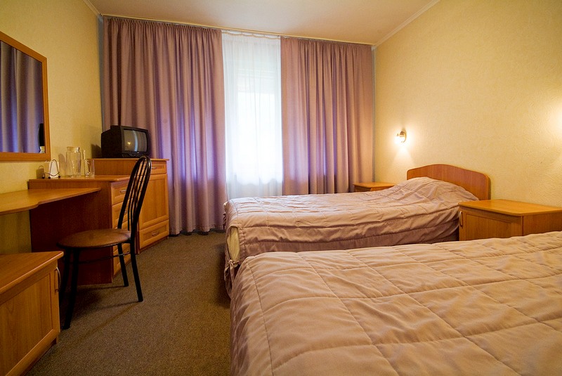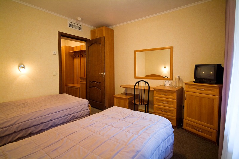 В номере: две односпальные кровати, тумбочки, холодильник, телевизор, стол, стулья, кресло.