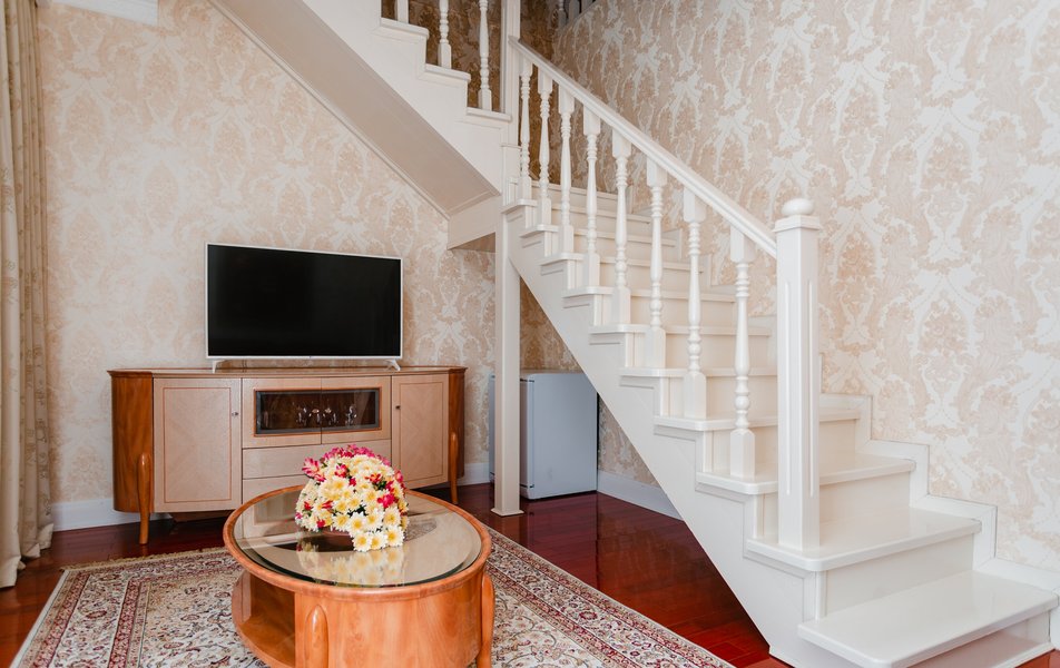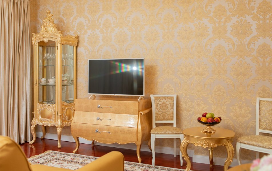 В номере: комод, кровать двуспальная, набор мягкой мебели, прикроватные тумбочки, диван, шкаф для посуды, кондиционер, телевизор, холодильник, электрочайник